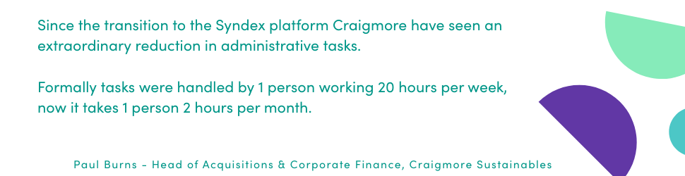 Since the transition to the Syndex platform Craigmore have seen an extraordinary reduction in administrative tasks. Formally tasks were handled by 1 person working 20 hours per week, now it takes 1 person 2 hours per month.